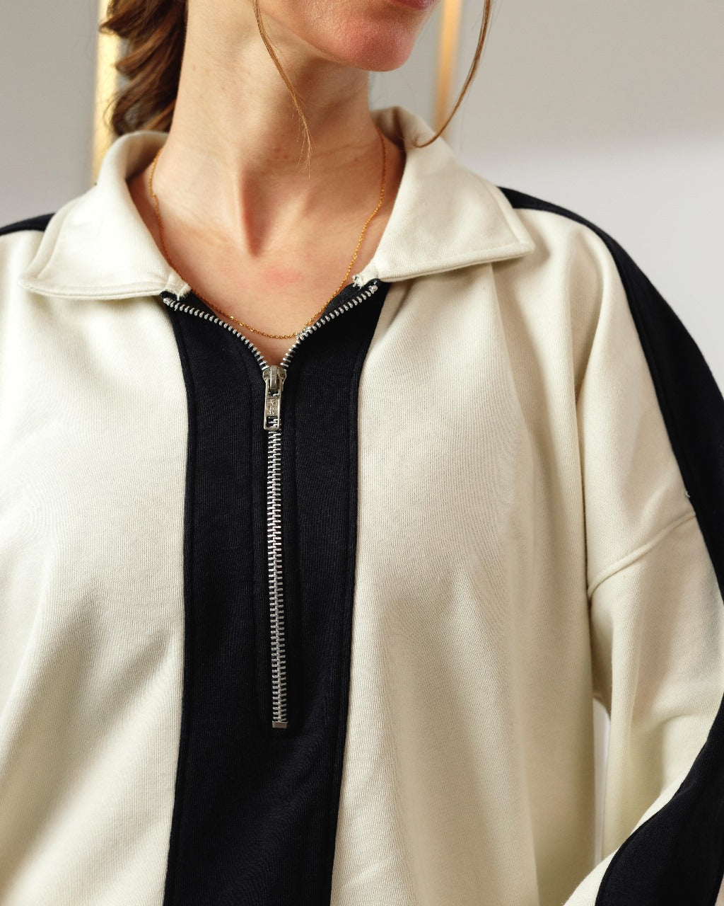 - Contrast black and beige colorblocking adds a striking, stylish edge